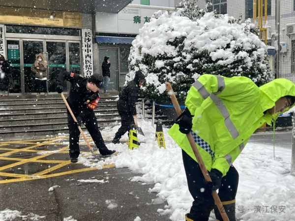 清掃過程中,大科城項目經理彭小軍、湘雅三醫院項目經理辛均文、長沙市第四醫院項目經理張軍等管理骨干率先垂范,沖在前、干在先,帶領隊員拿起掃把、鐵鍬等工具,按照“先主干道,后次干道”的原則,對路面進行清理。寒風直灌衣領,雨雪迷住雙眼,手腳凍得失去知覺,他們全然不顧,個個干得熱火朝天,道路上演奏著“咣咣咔咔嚓嚓”的掃雪除冰“交響曲”,干道上的積雪很快被清理干凈,一條條“平安路”呈現在市民面前。在清掃的同時,濱江保安還不忘提醒過往車輛和行人:“小心路滑,注意安全。”