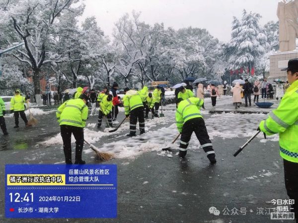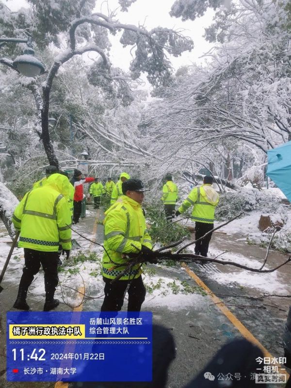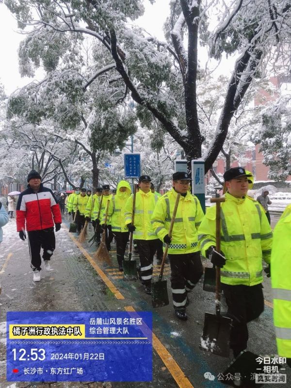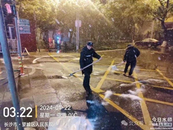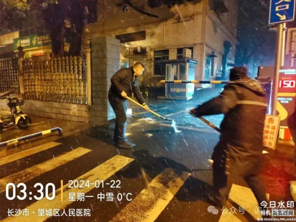 一場如約而至的大雪,讓望城區人民醫院項目經理歐勝姣惦記得難以入眠。凌晨3點左右,他仍無困意,見雪勢漸大,索性起床帶著晚班隊員鋪灑工業用鹽,防范于未然。天剛放亮,各項目都積極行動起來,發動隊員對轄區的主干道路面進行積雪鏟除、撒鹽化雪、鋪設麻袋、清理落枝,防止路面凍結,保證通行安全。
