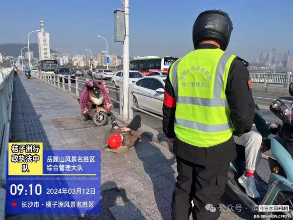 2024年3月12日上午9時(shí)03分,濱江保安公司岳麓山風(fēng)景名勝區(qū)綜合管理大隊(duì)的張軼軒在桔子洲一橋執(zhí)行巡查任務(wù)時(shí),發(fā)現(xiàn)一名戴紅色安全帽的男子因電動車事故躺在人行道上。現(xiàn)場雖人來人往,卻無人上前援助。張軼軒迅速上前了解情況后,立即報(bào)告了分隊(duì)長魯王俊杰。