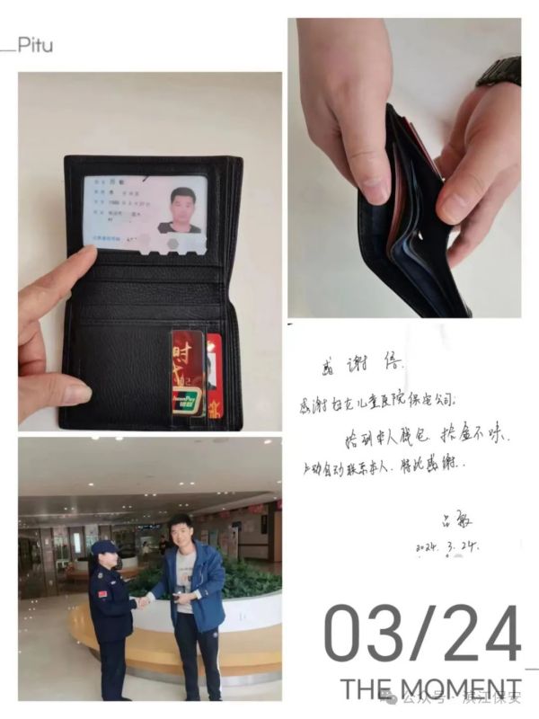 2024年3月25日11時(shí)55分,濱江保安公司湖南婦女兒童醫(yī)院保安隊(duì)南門崗隊(duì)員鄧文珍在例行巡邏時(shí),撿到一個黑色錢包。錢包內(nèi)有身份證、銀行卡和千余現(xiàn)金。鄧文珍立即著手尋找失主,經(jīng)過一番努力,他終于找到了失主呂先生并將錢包完好無損地交還。呂先生對鄧文珍拾金不昧的高尚品德表示深深的敬意,并親筆寫下感謝信以表達(dá)他的感激之情。